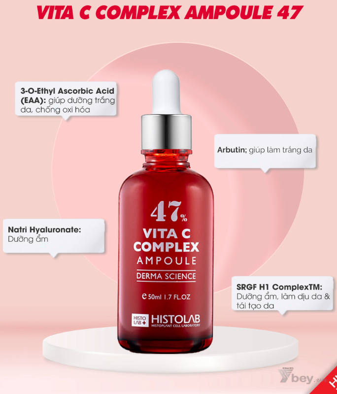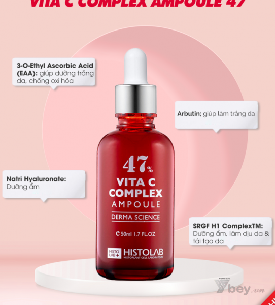 Histolab 47% Vita C Complex Ampoule Derma Science chứa 47% phức hợp Vitamin C cùng các hoạt chất: Arbutin, Hyaluronic,… giúp dưỡng trắng da, ngăn chặn sự hình thành melanin, làm mờ sạm nám và đốm nâu, cải thiện sắc tố, dưỡng đều màu da, thúc đẩy sản sinh collagen, tăng cường khả năng đàn hồi và săn chắc da, gia tăng tuần hoàn máu, lấy đi oxygen hoạt hóa, ngăn chặn lão hóa da, thu nhỏ lỗ chân lông, bổ sung các thành phần dưỡng chất thiết yếu từ thiên nhiên giúp dưỡng trắng sáng và trẻ trung hơn,…